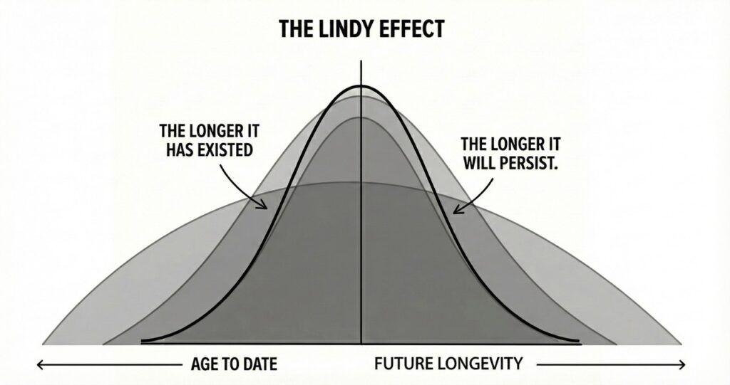 The concept originated in the 1960s among comedians at Lindy’s Deli in New York. They noticed a simple pattern: a Broadway show that had already been running for many years was more likely to continue running for many more years. Not because it was new or fashionable – but simply because it had survived.